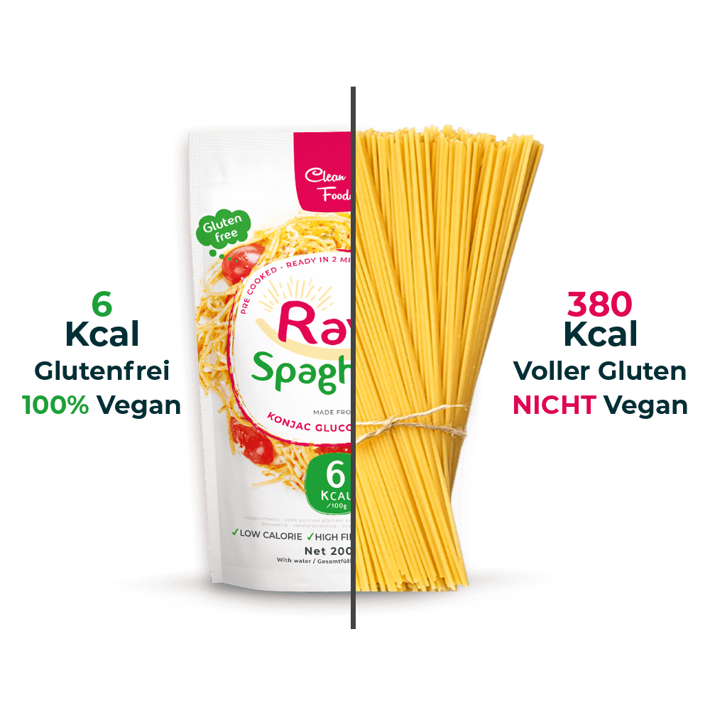 Ein großer Vorteil ist die Kalorienzufuhr: Normale Pasta enthält zumeist mehr als 400 kcal pro 100 Gramm, während RawPasta nur 6 kcal pro 100 Gramm enthält. Normale Nudeln werden aus Weizenmehl hergestellt und enthalten durch Zugabe von Soßen eine Menge Kohlenhydrate, Fette und Zucker. RawPasta hingegen wird aus der Konjakpflanze gewonnen und enthält daher keine Kohlenhydrate, Fette oder Zucker.